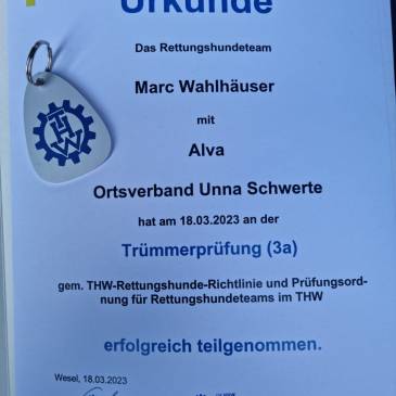 Am 18.3.2023 hat Alva aus unserem G-Wurf mit Marc die Trümmerprüfung (3a) als Rettungshundeteam im THW bestanden. Wir gratulieren den Beiden zu dieser tollen Leistung und freuen uns sehr darüber, besonders Papa Joshi ist stolz auf seine Tochter.